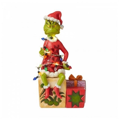 Grinch with string lights on Gifts. Udklædt som julemand tager Grinchen gaver i stedet for at give dem, men han vil helt sikkert bringe noget fest i dit hjem. Den ikoniske Grinch er lavet i højkvalitets resin og håndmalet af vores dygtige kunstnere. Den prisvindende kunstner Jim Shore har indarbejdet sin berømte stil med rosemaling og quiltningsmønstre i de karakterer, som Dr. Seuss.
